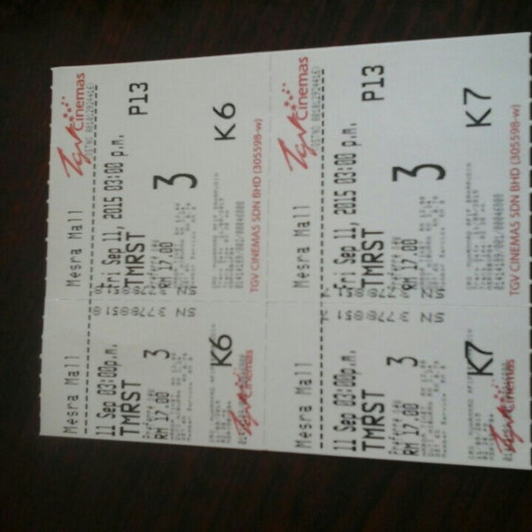 75m TGV Mesramall Kerteh Kemaman Terengganu. Note - Ticket purchase only available for GSC TGV mmCineplexes Amerin Cineplex Emperor Cinemas 10Star Cinemas Paragon Cinemas AE Cinemas and Mega Cineplex. 74m Mesra Mall Kemasek.
